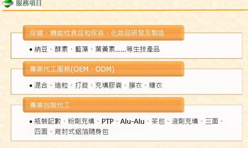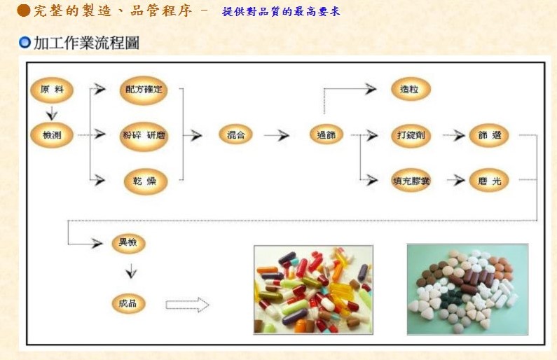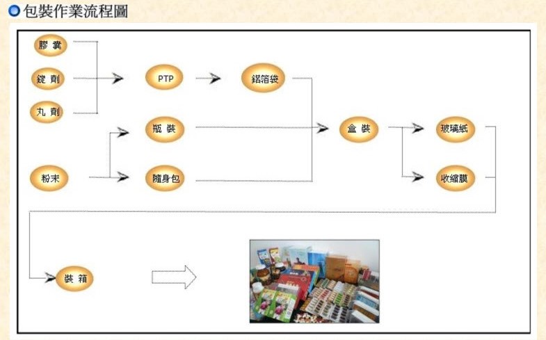 ![]() ![]() ![]() ![]() PTP共9條生產線(提供各式模型組具):使用PTP鋁箔片的優點保護產品的防潮,攜帶方便, 適用於各式膠囊錠劑丸劑等模型!如需使產品更加防潮可用PVDC的材料加裝鋁箔袋可使防 潮效果更好!本公司採用醫藥級P.V.C成型!提供各種色系,可增加美觀,提升產品品質!日 產每條工作線20-30萬粒 膠囊填充:從00號-4號各種膠囊尺寸均有日產約80萬顆 錠劑共7條生產線:具備各式模型組具,從100mg-1500mg皆可提供,並提供上膜衣,糖衣,錠 劑噴印Logo的服務!日產約180萬顆 直立式隨身包共8條生產線:提供各式尺寸及樣式(三面封,背式封)!可保護產品避免受潮, 攜帶方便,出門旅行便於使用!日產約18萬包 水平式隨身包:不同於傳統型直立式隨身包,外觀更多美觀,提供各式尺寸!日產約4萬包 雙層包隨身包機:有一般綿紙包與鋁箔包的材質!提供三面封,四面封,背式封,茶葉雙層包 等包裝種類!尺寸從1g-30g模組具備!日產約2萬包 全自動高速玻璃紙機:產品經玻璃紙包裝後增加美觀,提升商品的附加價值日產約18000盒 自動數粒入瓶機:亦提供全自動貼標機,適用於60-950c.c日產約2-3萬瓶