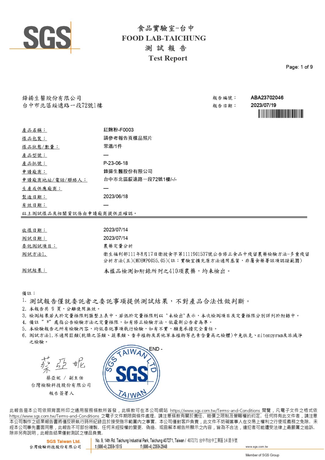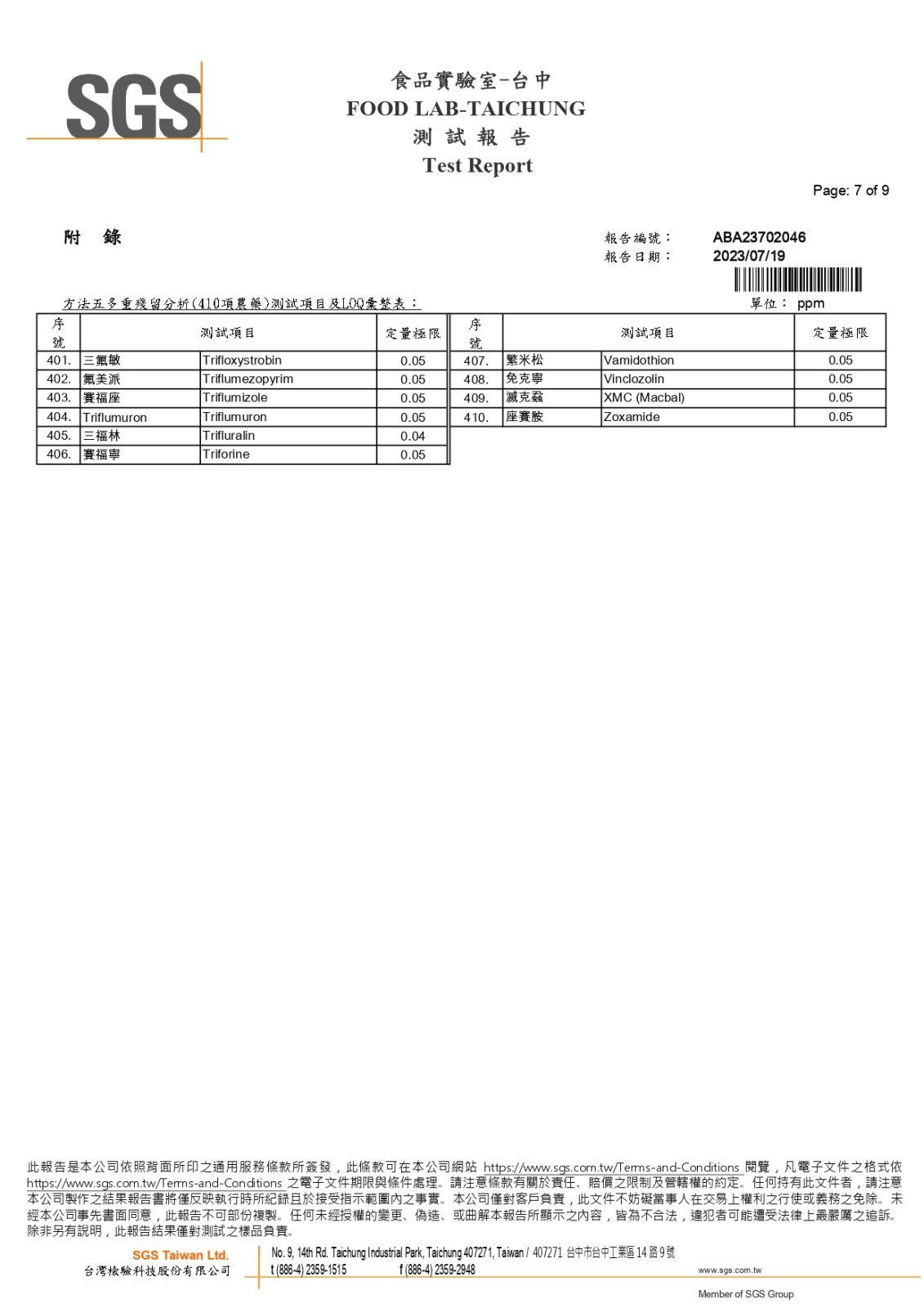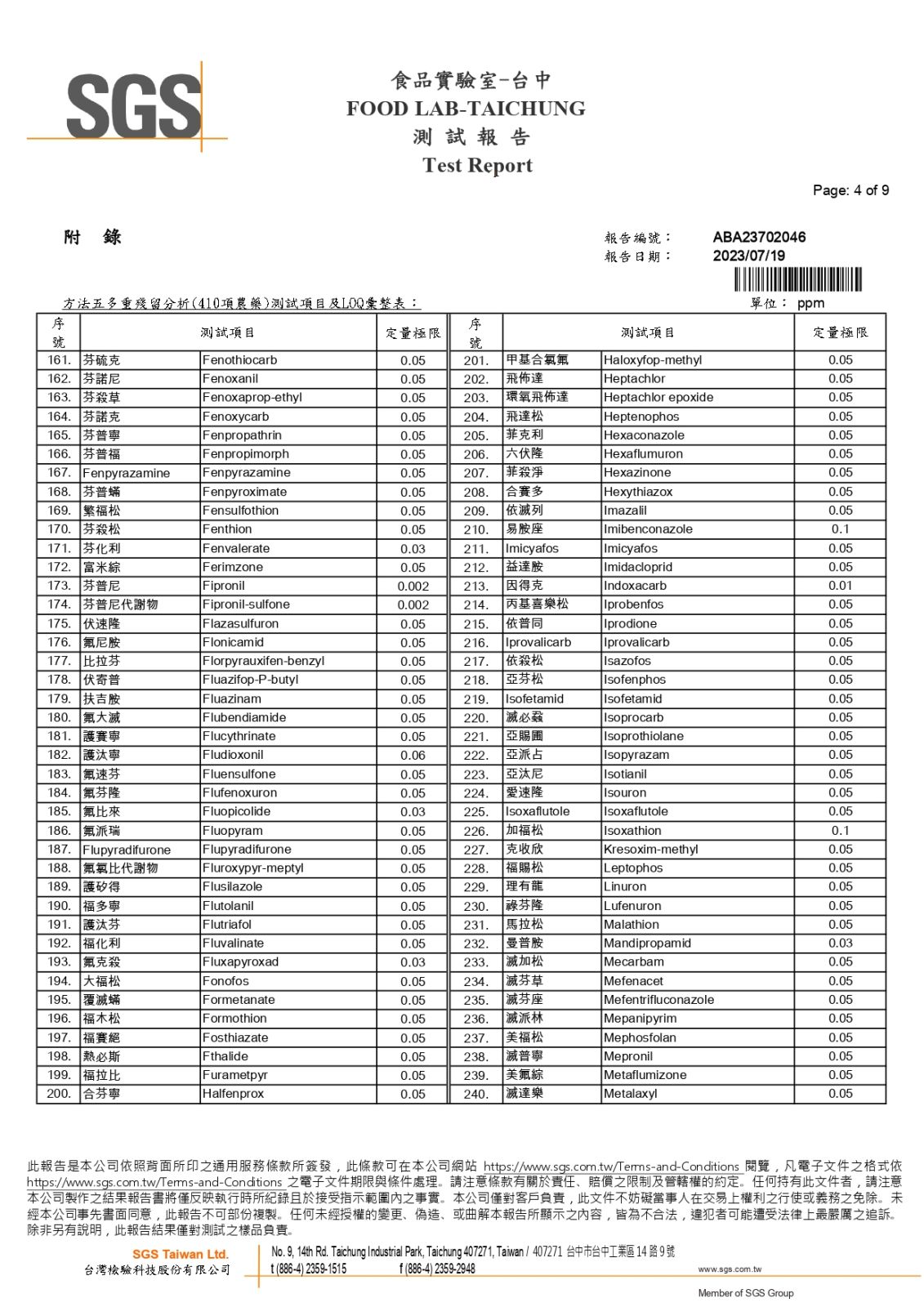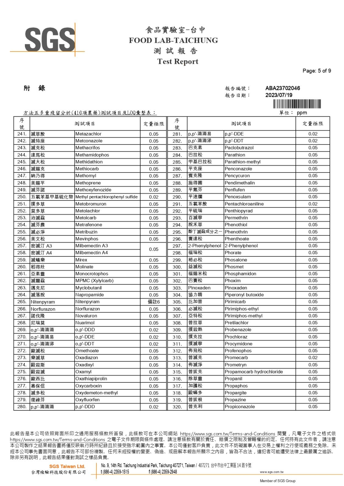 農藥410項檢測-SGS報告